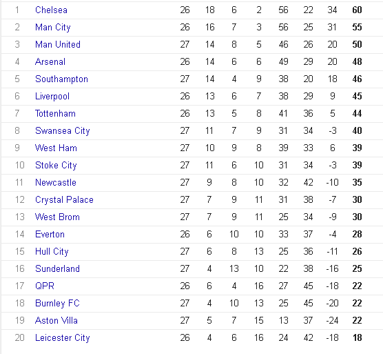 Carta Kedudukan Barclays Premier League Musim 2013 14 Kelab Peminat Liverpool Malaysia