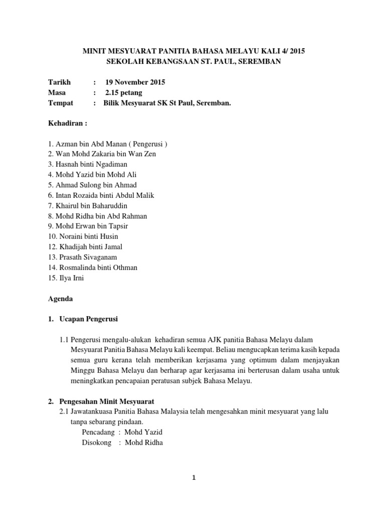 Minit Mesyuarat Panitia Bahasa Melayu Kali 4 2015